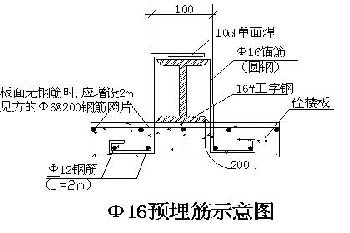 目前現(xiàn)場一般采用預(yù)埋筋的做法,根據(jù)計算采用預(yù)埋Φ16圓鋼即可滿足要求,懸挑梁應(yīng)設(shè)置兩道預(yù)埋筋,末端預(yù)埋筋為受力筋,距建筑外沿處的預(yù)埋筋為定位筋。懸挑梁的末端受力為受拉,因此受力筋應(yīng)采用未經(jīng)冷拉處理的Ⅰ級圓鋼。預(yù)埋筋采用兩段埋設(shè),以便安裝型鋼梁,型鋼挑梁安裝定位后,兩根預(yù)埋筋進行單面搭接焊,焊長為10d。