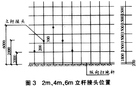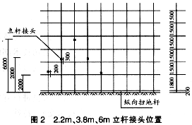 1.為達(dá)到合理有效使用長度為6m的立桿,并符合JGJ130—2001扣件式鋼管腳手架安全技術(shù)規(guī)范的要求,經(jīng)論證總結(jié)定首層立桿為2.2m、3.8m、6m或2m、4m、6m長,交錯(cuò)使用(圖2、3)
