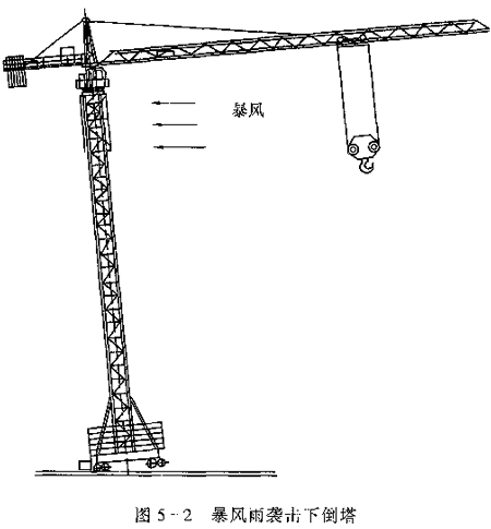 (10)行走式塔機(jī)因下班后忘記鎖夾軌器,晚上突遭風(fēng)暴襲擊而倒塔(見圖5—2)。