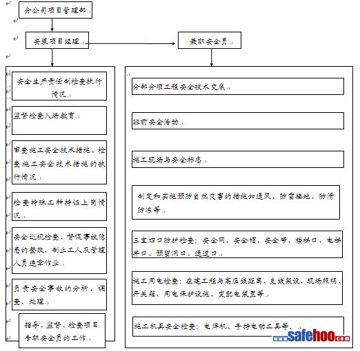 3. 制定安全生產(chǎn)崗位責(zé)任制,明確各部門和崗位人員的安全職責(zé)。分公司項(xiàng)目管理部、項(xiàng)目質(zhì)安員的主要安全職責(zé)詳見(jiàn)下圖。