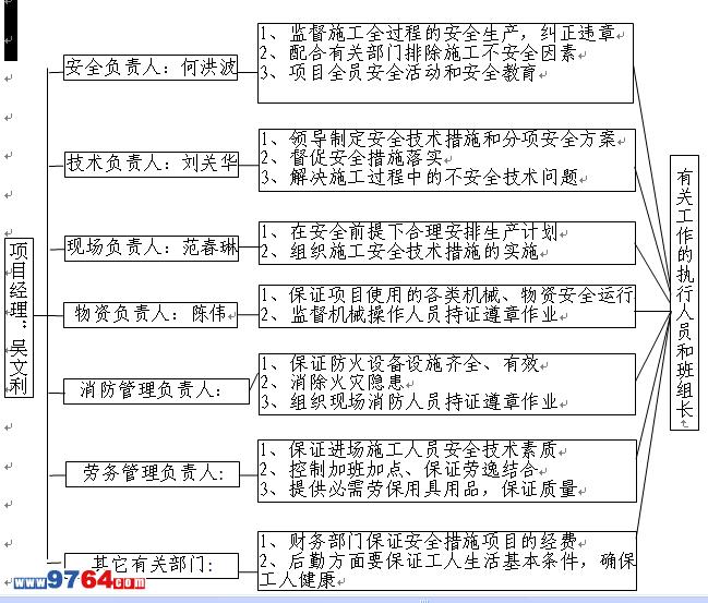 實(shí)行安全生產(chǎn)責(zé)任制,有組織、有領(lǐng)導(dǎo)地開展安全管理活動(dòng)。建立各級安全崗位責(zé)任制,將崗位責(zé)任制與經(jīng)濟(jì)掛鉤,形成上下齊抓共管的安全管理網(wǎng)絡(luò)。做到安全工作層層有人抓,工前有布置、工中有落實(shí)、工后有講評,項(xiàng)目負(fù)責(zé)人是安全生產(chǎn)的第一責(zé)任人,對安全負(fù)總責(zé)。