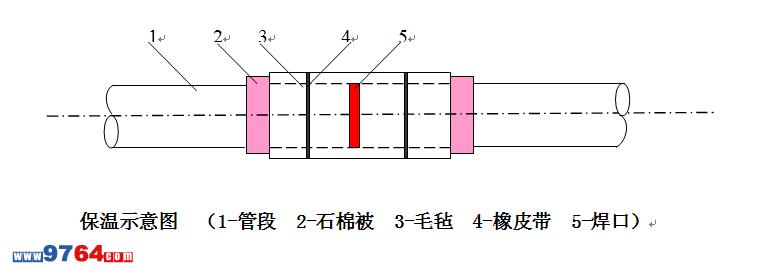 當(dāng)環(huán)境溫度低于5℃時(shí),應(yīng)采取焊后在焊道上加蓋保溫被的措施以防止焊道急驟降溫,保溫被為2.0m×1m×50mm的石棉被。具體做法是:用噴燈烘烤石棉被至80℃以上,然后立即將完成的焊口趁熱裹上并蓋上毛氈,用橡皮帶捆緊。保溫時(shí)間30分鐘—40分鐘,保溫示意圖如下:
