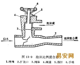 固定泡沫站一般由消防水泵、泡沫比例混合器、泡沫產(chǎn)生器(又稱泡沫室)、水池和泡沫液貯罐組成。泡沫比例混合器的作用是使泡沫液與水按一定比例進行混合其構(gòu)造如圖13—9。