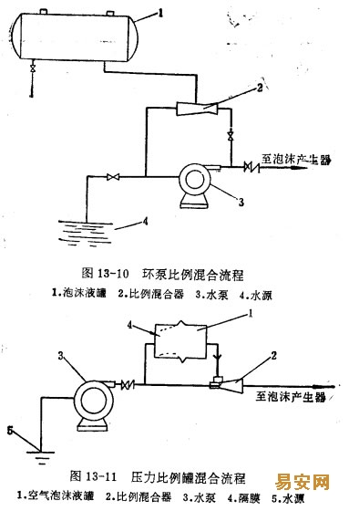 (1)環(huán)泵比例混合流程是目前國內(nèi)仍在采用的固定空氣泡沫消防流程,如圖13—l0所示。
