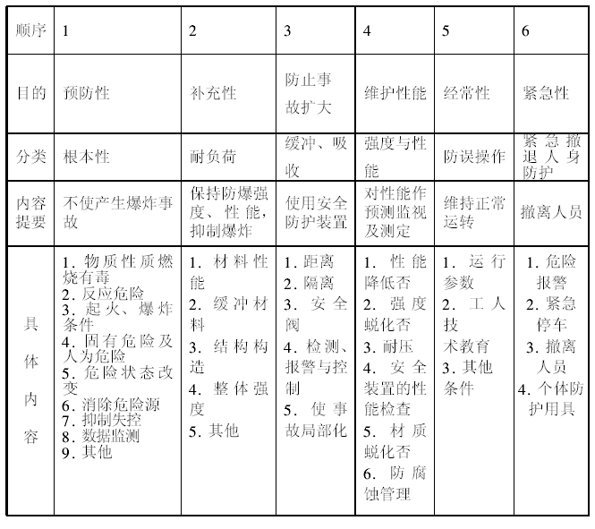 對(duì)于爆炸事故危險(xiǎn),必須視其危險(xiǎn)程度采取多層次控制原則,以增加其可靠性。一般包括6個(gè)層次,即根本的預(yù)防性控制、補(bǔ)充性控制、防止事故擴(kuò)大的預(yù)防性控制、維護(hù)性能控制、經(jīng)常性控制以及緊急性控制,詳見(jiàn)下表。