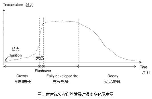 ????整個(gè)古建筑火災(zāi)過程大體可以分為起火、初期增長(zhǎng)、充分燃燒和減弱四個(gè)階段。如下圖1所示。