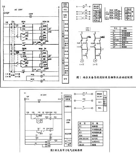 ??? 1、消防泵電氣控制:消防泵控制系統(tǒng)一般采取一用一備的消防控制系統(tǒng)。圖(1)是一用一備消防泵自耦降壓自動(dòng)控制電路圖。