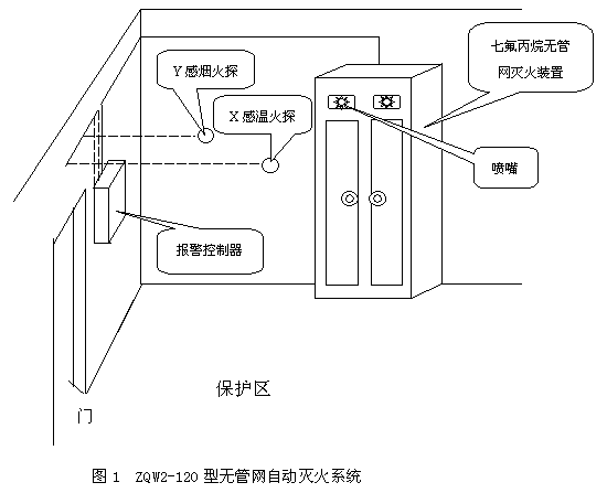 七氟丙烷無管網(wǎng)自動(dòng)滅火裝系統(tǒng)由火災(zāi)探測器、自動(dòng)報(bào)警控制器、滅火控制器、固定滅火裝置、滅火劑、輸送軟管道和噴嘴組成。