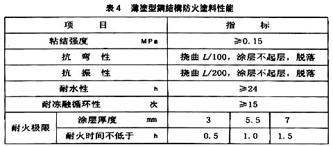 ??? 該規(guī)范規(guī)定,鋼結(jié)構(gòu)防火涂料均應(yīng)通過國家檢劇機(jī)構(gòu)檢測(cè)合格後,方可使用其中薄涂型鋼結(jié)構(gòu)防火涂料的主要技術(shù)性能應(yīng)符合表4的規(guī)定。