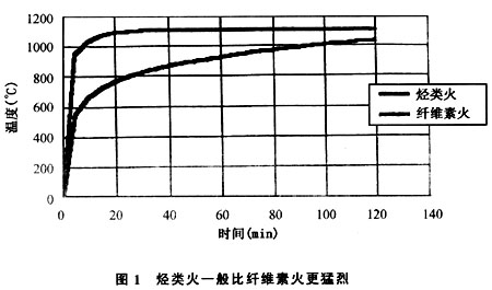 ??? 烴類火一般比纖維素火更猛烈(見圖1),這一點(diǎn)從BS476標(biāo)準(zhǔn)第20部分的曲線中也可以看出。