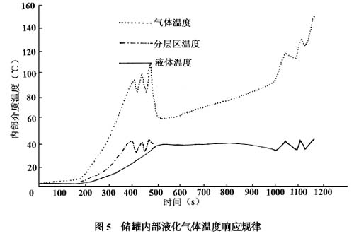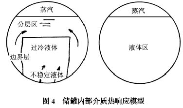 ??? 試驗發(fā)現(xiàn), 內(nèi)部介質的熱響應分為兩個階段: 在第一階段, 液相溫度未達到飽和溫度, 處于過冷狀態(tài), 內(nèi)部介質可以分為五個區(qū)域(如圖4) : 邊界層區(qū)、底部不穩(wěn)定液體區(qū)、分層區(qū)、過冷液體區(qū)和蒸汽區(qū)。在側面邊界層區(qū)內(nèi), 熱量由儲罐內(nèi)壁傳入后液體會沿容器壁面上升, 到底液體表面后向中心運動, 并且從中心向下部的過冷液體區(qū)運動, 與過冷液體混合。然后又進入邊界層區(qū), 重復上述傳熱過程。由于這種垂直方向的自然對流引起液體和氣體在垂直方向的溫度梯度, 這種現(xiàn)象稱為熱分層。在底部的不穩(wěn)定液體區(qū), 液體接受從儲罐內(nèi)壁傳入的熱量后, 直接垂直向上運動與過冷液體混合。