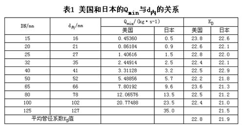 干粉滅火系統(tǒng)管道工作壓力是保證干粉滅火系統(tǒng)能正常工作的必要條件,通常包括管道中損失的壓力、噴頭的工作壓力、因位置高度不同而引起的表1 美國和日本的Qmin與d內(nèi)的關(guān)系平均管徑系數(shù)KD值壓力差等。一般情況下,后兩項比較容易確定,無需更多討論,在這里我們主要分析一下管道中的壓力損失。