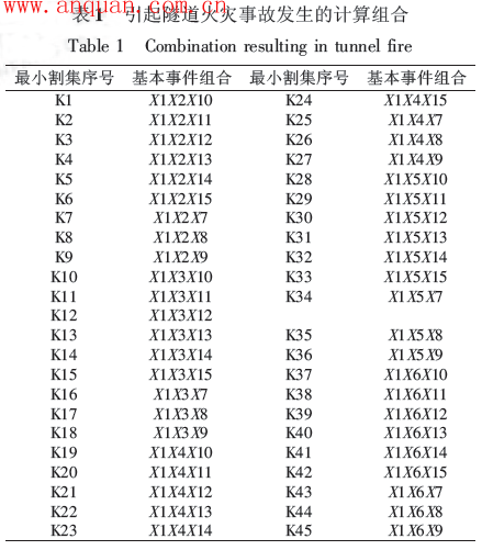 =(X2+A2)X1(B2+B3+B4+X7)? =(X2+X3+X4+X5+X6)X1(X7+X8+X9+X10+X11+X12+X13+X14+X15) 經過布爾代數運算,引起隧道火災事故發(fā)生的組合計算結果見表1。