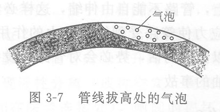 對(duì)于水擊產(chǎn)生的減壓波的危害也不能忽視,由于減壓波所到之處液壓降低,流速減慢,但其下游的液流在慣性的作用下繼續(xù)以原來(lái)速度流動(dòng),二者速度的差別使液體稀疏。當(dāng)液流的絕對(duì)壓力降到液體在當(dāng)時(shí)溫度下的飽和蒸氣壓力以下時(shí),液體就會(huì)汽化,產(chǎn)生氣泡。實(shí)際上,這種情況一般發(fā)生在管線(xiàn)拔高的地方,氣泡大多聚集在高點(diǎn)的下游,液流則從其下方通過(guò),如圖3—7所示。