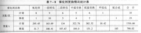 由表可見,一段轉(zhuǎn)化爐(氣化爐)事故次數(shù)為最多。發(fā)生催化劑損壞事故共5次。其中,一段轉(zhuǎn)化催化劑事故更換4次,合成催化劑更換1次。