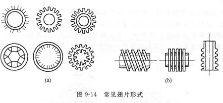 (4)翅片管換熱器? 翅片管換熱器又稱管翅式換熱器,其結(jié)構(gòu)特點是在換熱管的外表面或內(nèi)表面或同時裝有許多翅片。常用翅片有縱向和橫向兩類,如圖9—14所示。