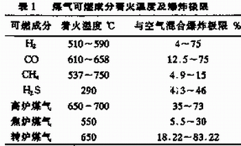 在實際工作中,凡是能夠引起可燃物燃燒的點火能源,我們系統(tǒng)為火源,主要包括明火、高 溫熱源、撞擊火花、靜電放電、電氣火花、雷電放電、化學反應(yīng)熱等等。要使可燃物燃燒, 火源必須具備一定的溫度和足夠的熱量?,F(xiàn)對煤氣可燃成分的著火溫度及爆炸極限進行分析 ,見下表1: