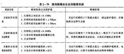 潤滑油溶劑脫蠟裝置安全自保聯(lián)鎖由于裝置本身特點(diǎn),主要焦中在冷凍系統(tǒng)冷凍壓縮機(jī)組,燕化煉油廠酮苯車間離心壓縮機(jī)安全自保聯(lián)鎖情況如表2—79所示。