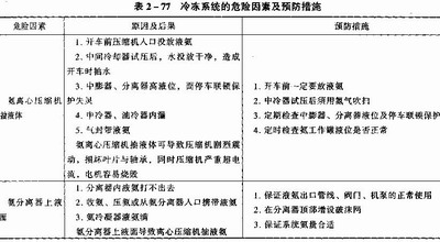 由于全國各潤滑油溶劑脫蠟裝置冷凍系統(tǒng)存在比較大的差別,但冷凍系統(tǒng)正常生產(chǎn)中危險(xiǎn)因素主要集中在氨壓縮機(jī)及背壓、分離器和中膨器兩器方面。冷凍系統(tǒng)的危險(xiǎn)因素及預(yù)防措施見表2—77。