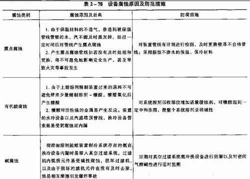 對于“老三套”中的潤滑油溶劑脫蠟裝置,若采取先酮苯脫蠟后溶劑精制加工工藝,設(shè)備腐蝕主要為低溫管線水霹點(diǎn)腐蝕;若采用先溶劑精制后酮苯脫蠟加工工藝,設(shè)備腐蝕除了露點(diǎn)腐蝕外,更主要的是為有機(jī)酸腐蝕。另外由于氨的存在和設(shè)備可能存在的泄露,本裝置還存在一定堿腐蝕。設(shè)備腐蝕原因及防范措施見表2—78。