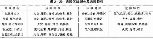 由于多種危險(xiǎn)物質(zhì)存在于整個(gè)工藝過程中,按照中石化及國家有關(guān)文件及法規(guī),該裝置主要危險(xiǎn)區(qū)域有:氧化反應(yīng)器、空壓機(jī)、加氫反應(yīng)器、氧化于燥機(jī)等系統(tǒng)如表3—31所示。