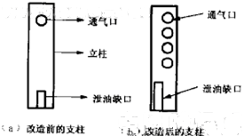 浮盤支柱下端的泄油口很小(見圖1(a)),如果被油泥堵塞,支柱內(nèi)的油就無法通過缺口排出。由于支柱內(nèi)油氣空間較小,如果對一條支柱動火,只能引發(fā)小范圍的火災(zāi)或輕微爆炸。為了防止支柱內(nèi)的油氣向罐內(nèi)揮發(fā),在設(shè)計(jì)上可以把支柱底部的泄油缺口改大,消除被油泥堵塞的危險(xiǎn)%或沿支柱多開幾個孔(見圖1(b))使其通風(fēng)透氣。