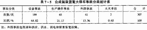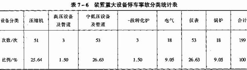 我國70年代引進的大型合成氨裝置,在生產初期曾頻繁發(fā)生事故。自1977年至1979年三年間,十一套裝置曾發(fā)生人身傷亡事故43次,重大停車事故307次。停車事故中以設備事故最多,停車次數為199次,占事故總數的64.82%。詳見表7—5。