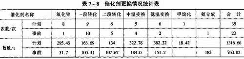 我國大型合成氨裝置投產初期,催化劑發(fā)生損壞的事故也較多。1977年到1980年四年期間,13套大型合成氨裝置八種催化劑中七種催化劑更換了58次。其中,因事故更換23次共760.02t,按計劃更換35次共1316.66t,事故更換催化劑占總更換量的36.6%。整爐更換共46爐。其中,事故更換13爐,計劃更換33爐。事故更換次數最多的是一段轉化催化劑。詳見表7—8(1) 。