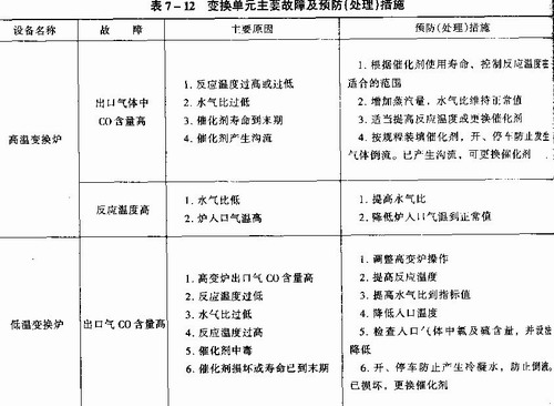 生產(chǎn)中,要將高溫、低溫變換爐人爐氣體中水蒸氣與一氧化碳的分子比(簡稱水氣比),保持在一定范圍內(nèi),還要將反應(yīng)溫度控制在最佳范圍內(nèi),以保證一氧化碳的變換率。生產(chǎn)中易發(fā)生的故障及預(yù)防(處理)措施見表7—12。