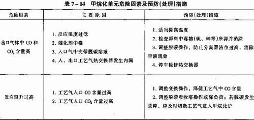 甲烷化爐中進行的甲烷化反應(yīng)是強放熱反應(yīng)。超溫易損壞甲烷化催化劑。甲烷化單元存在危險因素主要是催化劑超溫和出口CO、C02含量高。見表7—14。