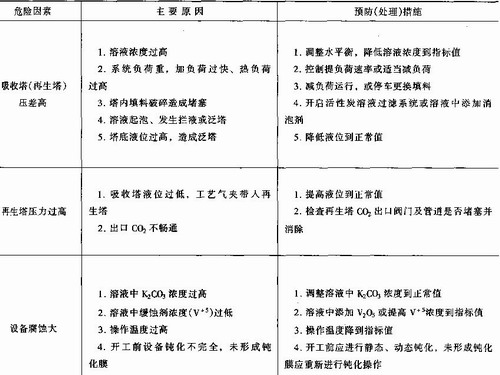 脫碳單元由于采用的吸收液為堿性液,具有腐蝕性。因而存在設(shè)備腐蝕的危險,其中以再沸器受到的腐蝕最為嚴(yán)重。脫碳吸收塔一般操作壓力為2.7MPa(表)。再生塔壓力為0.028MPa(表)[如二級再生為:一級0.1MPa(表),二級0.004MPa(表)],若吸收塔液位過低,工藝氣竄人再生塔,可造成再生塔超壓。如再生塔安全設(shè)施失靈,會導(dǎo)致發(fā)生重大爆炸、火災(zāi)事故。雖然吸收塔液位的控制都設(shè)有自動調(diào)節(jié)、報警、聯(lián)鎖裝置,再生塔也設(shè)有爆破板,但生產(chǎn)中仍需重點防范。此外,脫碳單元還存在影響吸收效率的各種因素詳見表7—13。