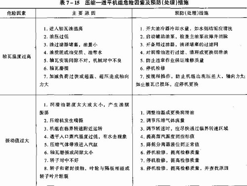 壓縮一透平大機組正常運行中影響因素較多,常見的危險因素有軸瓦溫度高、軸位移高、振動大、有異聲等,詳見表7—15。壓縮一透平機組如果零部件存在缺陷或質(zhì)量差,安裝維修達(dá)不到精度要求及操作不當(dāng)?shù)葮O易發(fā)生故障,甚至造成事故。特別在機組投運初期易發(fā)生。如某化肥廠1978年至1980年四年間,合成氣壓縮機高壓透平由于透平轉(zhuǎn)子存在設(shè)計缺陷,曾發(fā)生五次透平轉(zhuǎn)子葉片斷裂事故。又如某化肥廠1977年五月份一個月內(nèi),合成氣壓縮機高壓缸止推軸瓦由于違章作業(yè)、維修不當(dāng)造成三次燒軸瓦事故。