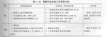 從催化劑類型分為兩段高溫加氫和一段低溫二段高溫加氫工藝。從加工物料分為全餾分加氫和分餾加氫。由油品的不同使用目的又可分為一段加氫和兩段加氫。加氫工藝類型比較如表3—12所示。