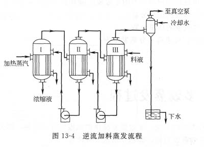 (2)逆流加料蒸發(fā)流程? 圖13—4是逆流加料的蒸發(fā)流程。原料液從末效蒸發(fā)加入,然后用泵送人前一效,最后從第1效取出完成液。蒸汽的流向則順序流過第Ⅰ、? Ⅱ、Ⅲ效,料液的流向與蒸汽的流向相反。