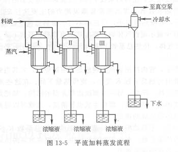 (3)平流加料蒸發(fā)流程? 圖13—5是平流加料的蒸發(fā)流程。每一效蒸發(fā)時都送入原料液,放出完成液。這種加料主要用在蒸發(fā)過程中有晶體析出的場合。