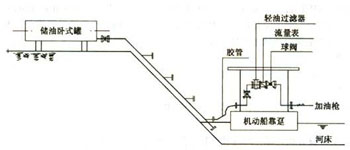 水上加油站的自流加油工藝如圖1、圖2,即固定式水上加油站和躉船式水上加油站一般都為自流加油。目前大都是流量計(jì)計(jì)量和手動(dòng)操作,它是由儲(chǔ)油設(shè)施、管線、耐油膠管、閘閥、球閥、過(guò)濾器、流量計(jì)及加油槍組成。這種自流加油的水上加油站除設(shè)施的安裝質(zhì)量需符合國(guó)家有關(guān)技術(shù)要求外,還應(yīng)注意解決以下兩個(gè)問(wèn)題。