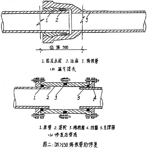 在漏氣接口處掐掉300mm,將接輪的兩部分分別套在左右兩管段上,然后將兩部分接輪在中間匯合安裝并將另兩端(壓蘭口)與原管線接合。(圖二)