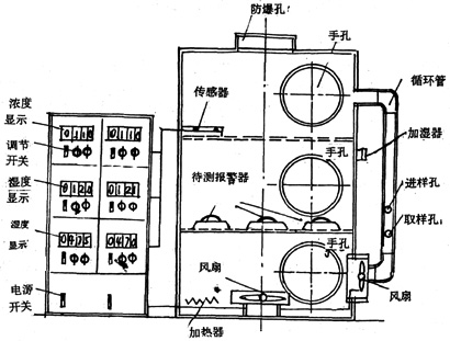 檢測(cè)箱上裝有循環(huán)管,管上安裝進(jìn)樣孔和取樣孔,循環(huán)管下端裝循環(huán)風(fēng)扇,迅速把樣氣帶進(jìn)檢測(cè)箱并被裝在箱底的攪拌風(fēng)扇攪均勻。