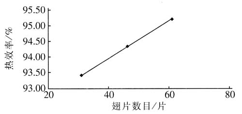 表2表明,冷凝換熱器翅片的數(shù)目對(duì)熱水器熱效率有影響,翅片數(shù)目越多則換熱器的熱效率也越高。翅片數(shù)目與熱水器熱效率的關(guān)系見(jiàn)圖4。圖4表明熱水器熱效率在一定范圍內(nèi)與翅片數(shù)目成線(xiàn)性變化。為了進(jìn)一步提高冷凝式燃?xì)鉄崴鞯臒嵝?,可以適當(dāng)增加冷凝式換熱器的翅片數(shù)目。