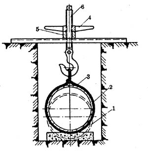 當(dāng)管道基礎(chǔ)粘軟,在路面重車的影響下造成管道局部下沉,原有管道坡度變化,使管道積水而堵塞,就必須進(jìn)行管道坡度的整理。這又稱整坡施工。該項(xiàng)施工需運(yùn)用大噸位牽引設(shè)備,將沉陷部位的管道吊至規(guī)定的坡度,并在管下部墊入柔性墊塊。簡單的牽引工具見圖2—9—2。