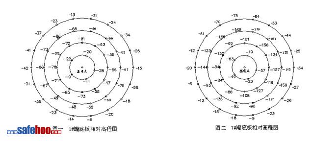 如圖一、圖二所示,底板中心附近和環(huán)梁高,而1/2D~環(huán)梁之間低,而且部分底板底部有懸空,在進(jìn)、出油操作中產(chǎn)生交變應(yīng)力作用,并容易折裂底板防腐層,使底板受到交變應(yīng)力腐蝕和電化學(xué)腐蝕。