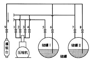 這種流程,必須具備氣相和液相兩根管道和兩個(gè)以上的儲(chǔ)罐才可采用。在灌瓶前需用壓縮機(jī)加壓一定時(shí)間,在壓縮機(jī)啟動(dòng)后,不能馬上進(jìn)行灌瓶。操作比較麻煩。