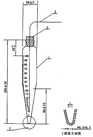 (1)離心管:100mL,其形狀尺寸如圖1-6-11所示。0~0.5mL刻度范圍內(nèi)的分刻度為0.05mL。管的下端錐度必須均勻,底部應(yīng)是圓形的。用耐熱玻璃制造并經(jīng)充分退火處理。壁厚不少于1.5mm。離心管的刻度公差見表1-6-8。