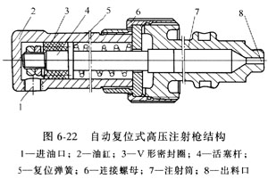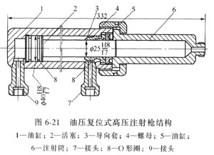 ②油壓復(fù)位式高壓注射槍 其基本結(jié)構(gòu)如圖6-21所示。