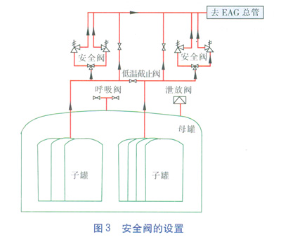 7個(gè)子罐共分為2組,1組3個(gè)子罐,1組4個(gè)子罐。每組子罐氣相管路上各設(shè)置1個(gè)DN 50mm的自力式降壓調(diào)節(jié)閥;總BOG管路上設(shè)置1個(gè)DN?100mm的BOG壓力控制閥;設(shè)置的4個(gè)安全閥(DN 80mm)和1個(gè)泄放閥(DN 250mm)、1個(gè)呼吸閥(DN 200mm)見圖3。