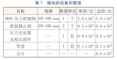 設(shè)置BOG壓力控制閥,需要增加一套BOG壓力控制系統(tǒng),即需要增加相應(yīng)的設(shè)備和管道,因此相應(yīng)的造價(jià)也要增加。增加的設(shè)備和管道見表1。