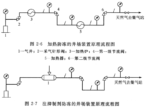 比較典型的井場裝置流程,也是目前現場通常采用的有兩種類型:一種是加熱天然氣防止生成水合物的流程;另一種是向天然氣中注入抑制劑防止生成水合物的流程,如圖2-6和圖2-7所示。