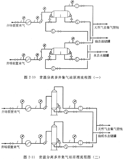 圖2-10租圖2-11所示僅為兩口氣井的常溫分離多井集氣站。多井集氣站的井數取決于氣田井網布置的密度,一般采氣管線的長度不超過5km,井數不受限制。以集氣站為中心,5km為半徑的面積內,所有氣井的天然氣處理均可集于集氣站內。圖2-10中管線和設備與圖2-8相同,圖2-11中管線和設備與圖2-9相同,此處流程簡述從略。