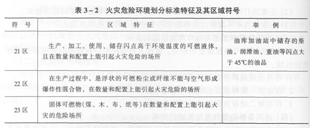 根據(jù)火災(zāi)事故發(fā)生的可能性和后果、危險程度及物質(zhì)狀態(tài)的不同,《爆炸和火災(zāi)危險環(huán)境電力裝置設(shè)計規(guī)范》(CB 50058)將火災(zāi)危險環(huán)境劃分為3個危險區(qū)域,見表3—2。