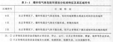 爆炸性環(huán)境的分區(qū)是根據(jù)爆炸性氣體混合物出現(xiàn)的頻繁程度和持續(xù)時間確定的。國家標(biāo)準(zhǔn)《爆炸和火災(zāi)危險環(huán)境電力裝置設(shè)計規(guī)范》(CB 50058)將爆炸性氣體環(huán)境劃分為三級危險區(qū)域,見表3—1。